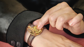 Sie trägt eine Uhr, auf der sie die Zeiger erfühlen kann.