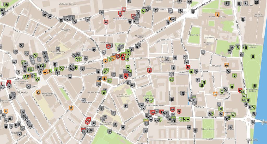 Within two weeks people around the world marked more than 20,000 places green, yellow or red. This made some cities very colorful, as one can see in this before and after image of London.